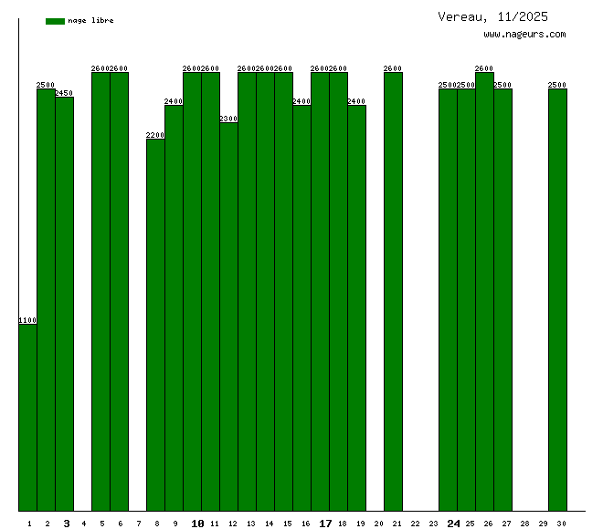 Ces 6 derniers mois, Vereau a nagé dans les piscines suivantes : Centre Aquatique Intercommunal Paris - Vallée de la Marne (Champs-sur-Marne) (114.6 km), Piscine Municipale de Fontenay sous Bois (72.7 km), Piscine de Nogent-sur-Marne (54.2 km), Centre Aquanautique Camille Muffat (Rosny sous Bois) (20.5 km), Piscine du Remblai (Les Sables d'Olonne) (7.4 km), Piscine des murs à pêches (Montreuil) (5 km), Piscine de Brive-la-Gaillarde (4.9 km), Piscine Annette Kellermann (La Courneuve) (4.9 km), Espacéo L'Odyssée (Aulnay-sous-Bois) (4.8 km), Centre aquarécréatif d'Égletons (3 km), Piscine Yvonne Godard (Paris) (2.6 km), Piscine d'Orsay (2.5 km), Palais Mirage Atlas Hotel (Marrakech, Maroc) (2.5 km), Centre Nautique de Chelles (2.5 km), Centre Aquatique du Val d'Amboise (2.5 km), Annette K. (Port Javel Bas, Paris 15ème (M° Javel)) (1.9 km), Villa Bellagio Amboise (900m).