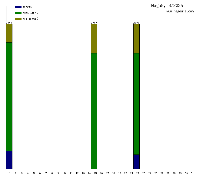 Ces 6 derniers mois, Waga8 a nagé dans les piscines suivantes : Piscine Henry de Montherlant (Paris) (14 km), Piscine Jacqueline Auriol (Paris) (10 km), Piscine Marjorie-Gestring (ex Champerret) (Paris) (2 km).