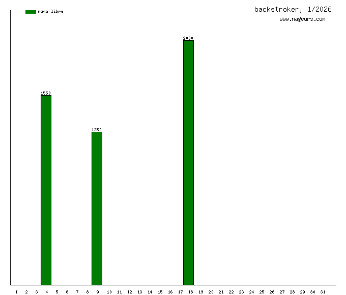 Ces 6 derniers mois, backstroker a nagé dans les piscines suivantes : Piscine de Sucy-en-Brie (51.5 km), Piscine des Bordes (Chennevières-sur-Marne) (2 km), Piscine de Charenton le Pont (Complexe Télémaco Gouin) (Charenton-le-Pont) (1000m).
