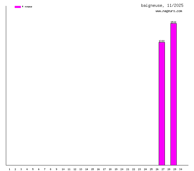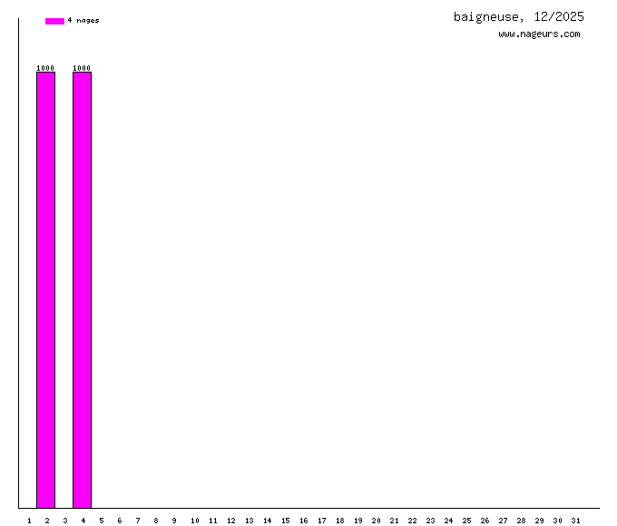 Ces 6 derniers mois, baigneuse a nagé dans les piscines suivantes : Piscine municipale de Céret (15 km), Piscine Port Marchand (Toulon) (7.8 km), Piscine municipale d'Amélie-les-Bains-Palalda (6 km), Piscine municipale de Argelès-sur-Mer (3 km), Complexe aquatique de Hyères (2 km).
