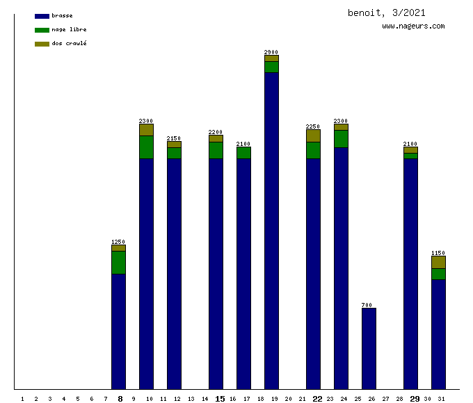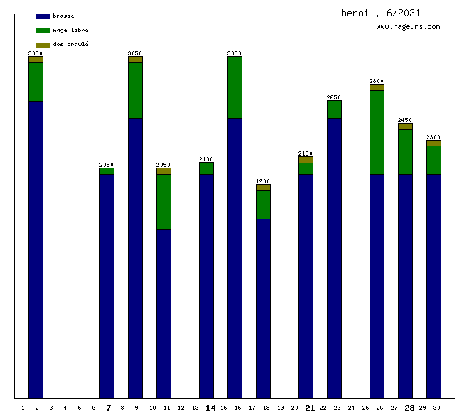 Ces 6 derniers mois, benoit a nagé dans les piscines suivantes : Piscine du Grand Jardin (Moret-sur-Loing) (139 km), Espace Aquatique Aquanoblat (Saint-Léonard-de-Noblat) (14.8 km), Piscine de la Faisanderie (Fontainebleau) (4.2 km).