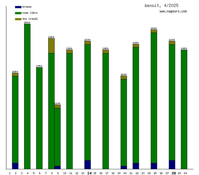 Ces 6 derniers mois, benoit a nagé dans les piscines suivantes : Piscine du Grand Jardin (Moret-sur-Loing) (135.8 km), Espace Aquatique Aquanoblat (Saint-Léonard-de-Noblat) (14.8 km), Piscine de la Faisanderie (Fontainebleau) (4.2 km).