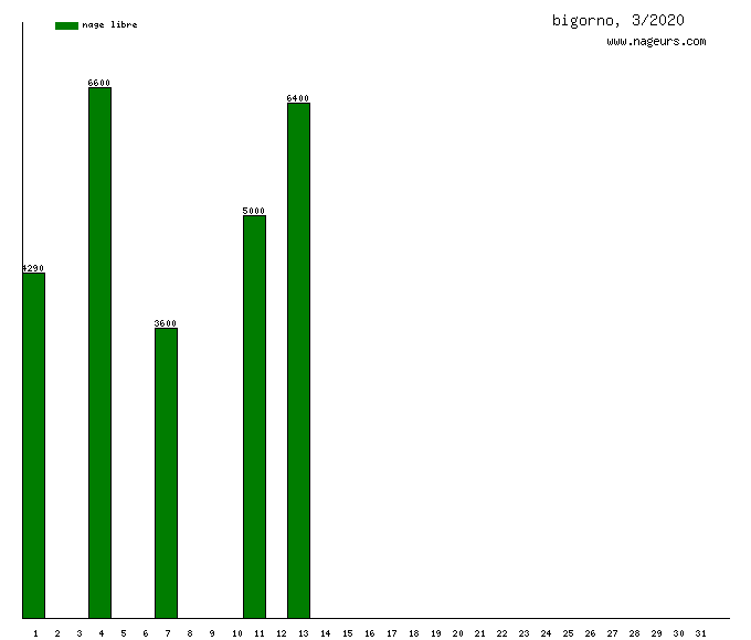 Ces 6 derniers mois, bigorno a nagé dans les piscines suivantes : Piscine Butte aux Cailles (Paris) (269.8 km), Annette K. (Port Javel Bas, Paris 15ème (M° Javel)) (21 km), Piscine Dunois (Paris) (15.7 km), Piscine de Pontoise (Paris) (11.7 km), Piscine Jean Boiteux, ex Reuilly (Paris) (4 km).