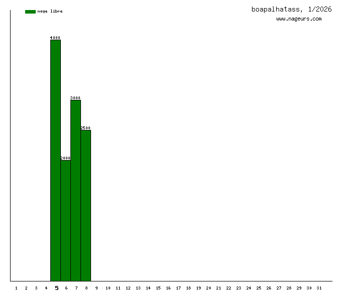Ces 6 derniers mois, boapalhatass a nagé dans les piscines suivantes : Piscine intercommunale du Sicoval (Saint-Orens-de-Gameville) (216.8 km), Piscine Alex Jany (Ramonville Saint-Agne) (19.5 km).