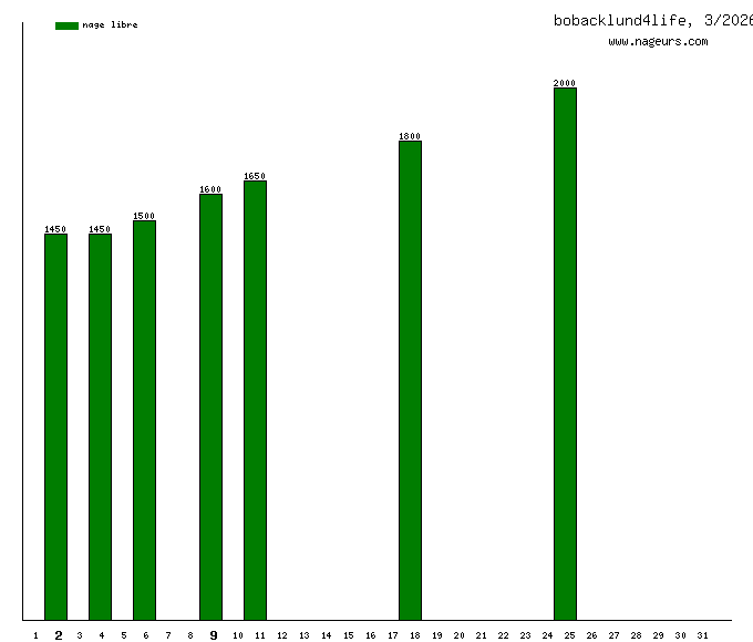 Ces 6 derniers mois, bobacklund4life a nagé dans les piscines suivantes : Piscine René et André Mourlon (Paris) (44.3 km), Piscine Paul Valeyre (Paris) (21.8 km), Piscine Bertrand Dauvin (Paris) (16 km), Embarcadero YMCA (San Francisco, Etats Unis) (8.5 km), Piscine Aspirant Dunand (Paris) (2.3 km), Piscine Emile Anthoine (Paris) (2.3 km), Piscine Marie-Marvingt (ex Saint Merri) (Paris) (2.1 km), London Aquatics Center (London, Royaume Uni) (1.2 km).