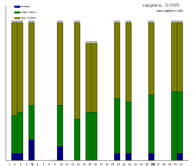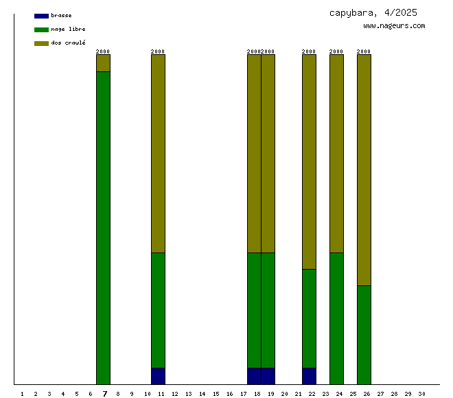 Ces 6 derniers mois, capybara a nagé dans les piscines suivantes : Piscine Plein Sud (Lille) (130.1 km), Piscine Suzanne Berlioux (Paris) (2 km), Piscine Olympique Marx Dormoy (Lille Bois Blancs) (1.4 km).
