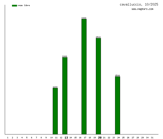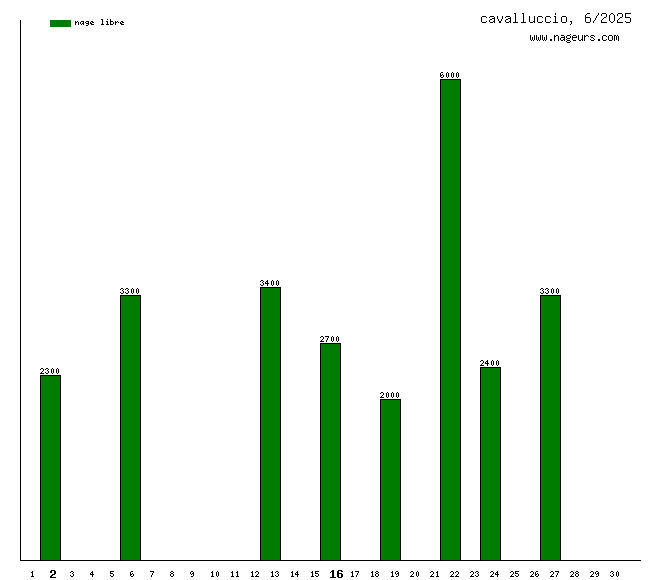 Ces 6 derniers mois, cavalluccio a nagé dans les piscines suivantes : Piscine Butte aux Cailles (Paris) (42.3 km), Piscine des Vergers (Meyrin, Suisse) (8.6 km), Piscine de plein air des Marquisats (Annecy) (5 km), Piscina di Cascina (Cascina PI , Italie) (4.4 km), Piscine Dunois (Paris) (2.6 km), Centre Aquatique Au Fil de l'O (Saint-Genis-Pouilly) (2 km), Piscina communale de Pisa (PISA, Italie) (1.5 km), Piscine Thérèse et Jeanne Brulé (ex Elisabeth) (Paris) (1000m).