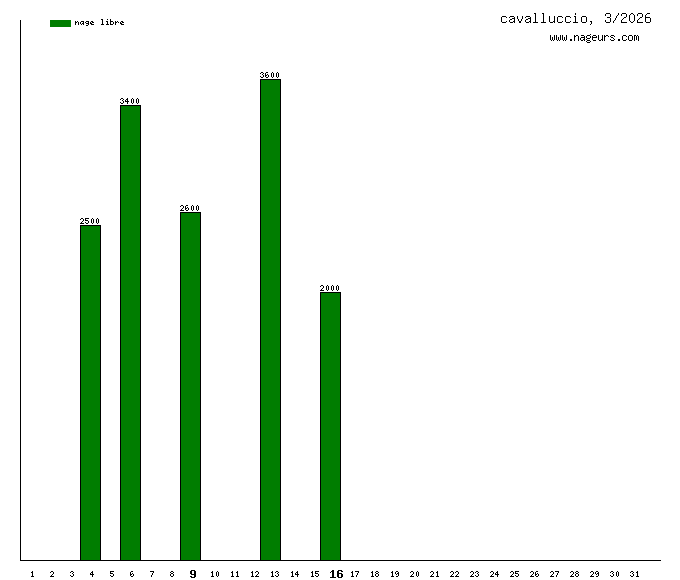 Ces 6 derniers mois, cavalluccio a nagé dans les piscines suivantes : Piscine Butte aux Cailles (Paris) (64.2 km), Piscine Château des Rentiers (Paris) (2.8 km), Piscine Dunois (Paris) (2.6 km), Centre Aquatique Au Fil de l'O (Saint-Genis-Pouilly) (2 km), Piscina communale de Pisa (PISA, Italie) (1.5 km), Piscine Thérèse et Jeanne Brulé (ex Elisabeth) (Paris) (1000m).