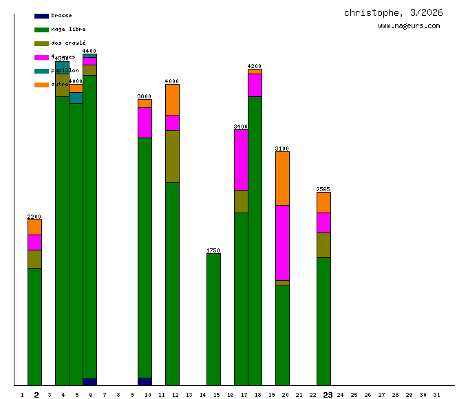 Ces 6 derniers mois, christophe a nagé dans les piscines suivantes : Piscine Blomet (Paris) (160 km), Centre Aquatique Olympique (Saint-Denis) (32.9 km), Piscine Jacqueline Auriol (Paris) (15.2 km), Piscine Georges Drigny (Paris) (4.6 km), Piscine Armand Massard (Paris) (4.5 km), Piscine Henry de Montherlant (Paris) (3.2 km), Piscine Thérèse et Jeanne Brulé (ex Elisabeth) (Paris) (1.7 km).