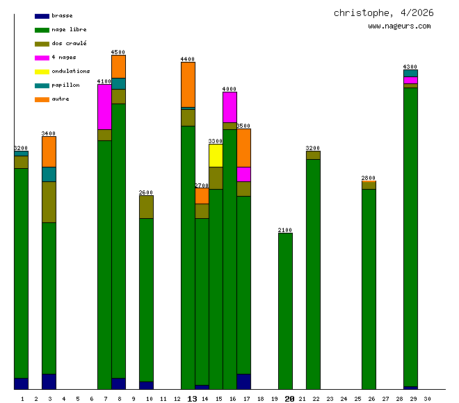 - • 3200 mètres le mercredi 1 avril (de 19h30 à 21h00) à Piscine Blomet (Paris) - Club, bonne série de crawl, dont un 200m en 2"38 (bassin de 25m).