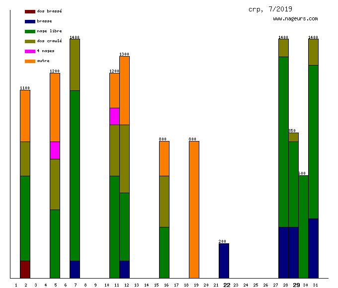 Ces 6 derniers mois, crp a nagé dans les piscines suivantes : Piscine Yvonne Godard - ex Pech David (Toulouse) (10.2 km), Piscine Bellevue (Toulouse) (1.4 km), Piscine municipale de Castanet-Tolosan (1.2 km), Piscine Alex Jany (Toulouse) (1.1 km), Calicéo Toulouse L'Union (800m).