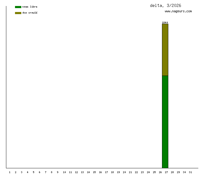Ces 6 derniers mois, delta a nagé dans les piscines suivantes : Piscine Butte aux Cailles (Paris) (10.8 km), Piscine Blomet (Paris) (1.5 km).