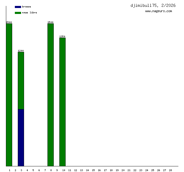 Ces 6 derniers mois, djimibull75 a nagé dans les piscines suivantes : Piscine Fernand Blanluet (Le Pré-Saint-Gervais) (21.2 km), Piscine Mulighausen (Les Lilas) (19.3 km), Piscine Georges Vallerey (Paris) (2.4 km).