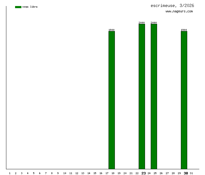 Ces 6 derniers mois, escrimeuse a nagé dans les piscines suivantes : Piscine du Kremlin-Bicêtre (Le Kremlin-Bicêtre) (21 km), Piscine du 8 mai 1945 (Vitry-sur-Seine) (14 km), Stade nautique Youri Gagarine (Villejuif) (3.6 km).