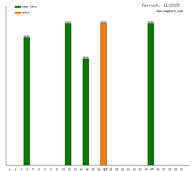 Ces 6 derniers mois, ferruch a nagé dans les piscines suivantes : Stade Nautique d'Auxerre (36.7 km), Piscine de Néris les Bains (4.8 km), Centre aqualudique La Loue (Saint Victor) (3.5 km), Piscine Montbauron (Versailles) (2 km), Centre aquatique Le Flow (Saint Florentin) (2 km), Complexe sportif Alice Milliat Millau (1.5 km).
