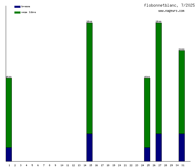 Ces 6 derniers mois, flobonnetblanc a nagé dans les piscines suivantes : Piscine Plijadour (Carhaix-Plouguer) (37.5 km), Piscine Chantereyne (Cherbourg) (12.7 km), Centre aquatique Equeurdreville (Equeurdreville-Hainneville) (1.5 km).
