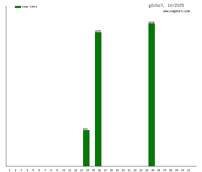 Ces 6 derniers mois, g2cho7 a nagé dans les piscines suivantes : Piscine Georges Vallerey (Paris) (17.8 km), Piscine Georges Hermant (Paris) (2 km), Piscine Yvonne Godard (Paris) (500m).