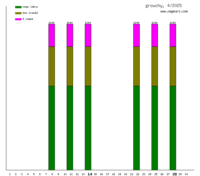 Ces 6 derniers mois, grouchy a nagé dans les piscines suivantes : Zwembad De Zijl (Leiden, Hollande) (20.8 km), Piscine Saint Germain (Paris) (5.2 km), Piscine Suzanne Berlioux (Paris) (3.7 km), Piscine Grouchy (Saint-Étienne) (2.5 km), Piscine Thérèse et Jeanne Brulé (ex Elisabeth) (Paris) (1.3 km).