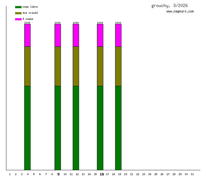 Ces 6 derniers mois, grouchy a nagé dans les piscines suivantes : Zwembad De Zijl (Leiden, Hollande) (19.5 km), Piscine Saint Germain (Paris) (11.8 km), Piscine Thérèse et Jeanne Brulé (ex Elisabeth) (Paris) (2.6 km), Centre aquatique de Neuilly-sur-Seine (1.5 km), Centre nautique Raymond Boisdé (Bourges) (1.5 km), Piscine Suzanne Berlioux (Paris) (1.2 km).