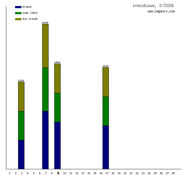 Ces 6 derniers mois, insidious a nagé dans les piscines suivantes : Centre Aquatique Olympique Laure-et-Florent Manaudou (Colombes) (29.2 km), Centre nautique de Bron (8.5 km), Centre Aquatique Les Vagues (Meyzieu) (4 km), Centre Nautique Charras (Courbevoie) (2 km).