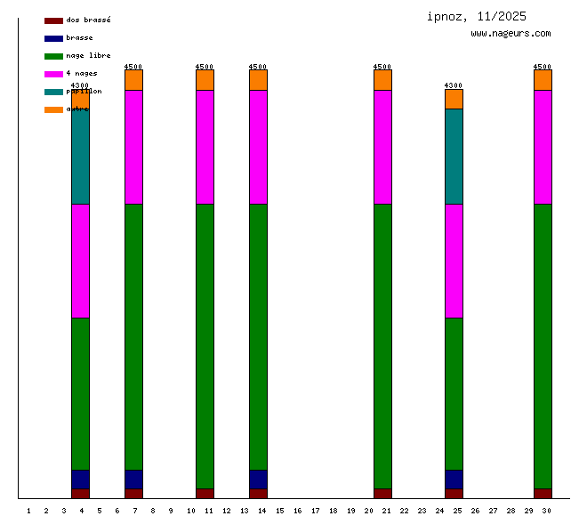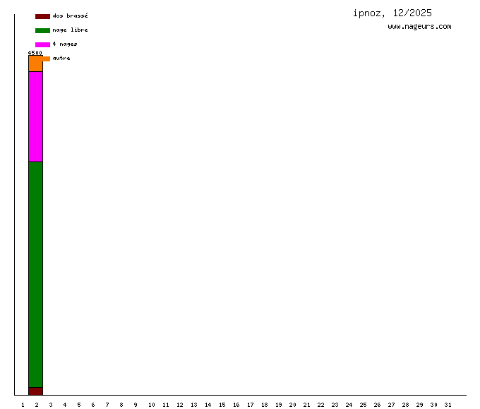 Ces 6 derniers mois, ipnoz a nagé dans les piscines suivantes : Piscine Bernard Lafay (Paris) (45.9 km), Piscine Solita Salgado (Paris) (44.2 km), Centre Nautique Charras (Courbevoie) (42.2 km), Piscine Marjorie-Gestring (ex Champerret) (Paris) (17.9 km), Piscine Bertrand Dauvin (Paris) (13.9 km), Piscina Solari (Milano, Italie) (9.4 km), Piscine Paul Valeyre (Paris) (9.2 km).