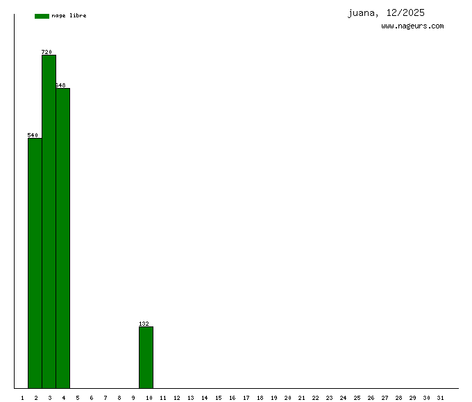 Ces 6 derniers mois, juana a nagé dans les piscines suivantes : Piscine Guy Bey (Meudon) (4.6 km), Piscine de Pontoise (Paris) (2.5 km), Thermes marins (Saint-Malo) (1.9 km).