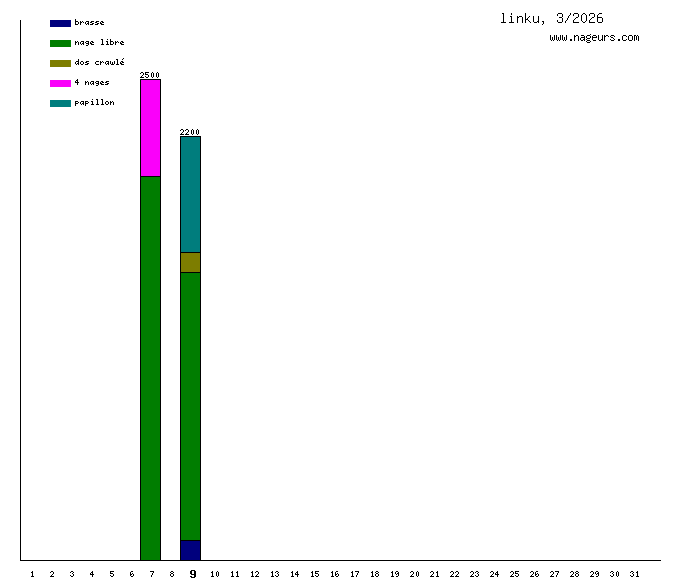 Ces 6 derniers mois, linku a nagé dans les piscines suivantes : Centre Aquatique Olympique (Saint-Denis) (41.5 km), Piscine Thérèse et Jeanne Brulé (ex Elisabeth) (Paris) (24.4 km), Piscine de l'INSEP (Paris) (16.1 km), Piscine de Bagneux (15.5 km), Piscine Butte aux Cailles (Paris) (8.6 km), Centre aqualudique La Loue (Saint Victor) (2.2 km), Piscine municipale Jean Andrieu (Choisy-le-Roi) (2.2 km), Aquapol (Montrouge) (2.1 km), Centre Aquatique La Vague (Palaiseau) (2.1 km), Palais des Sports Maurice Thorez (Nanterre) (800m).