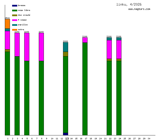 Ces 6 derniers mois, linku a nagé dans les piscines suivantes : Centre Aquatique Olympique (Saint-Denis) (46.1 km), Piscine de Bagneux (26.4 km), Piscine Thérèse et Jeanne Brulé (ex Elisabeth) (Paris) (24.4 km), Piscine de l'INSEP (Paris) (16.1 km), Piscine Butte aux Cailles (Paris) (3.5 km), Piscine Alfred Nakache (Paris) (3 km), Piscine municipale Jean Andrieu (Choisy-le-Roi) (2.2 km), Aquapol (Montrouge) (2.1 km), Centre Aquatique La Vague (Palaiseau) (2.1 km), Palais des Sports Maurice Thorez (Nanterre) (800m).