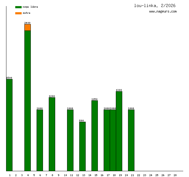 Ces 6 derniers mois, lou-linka a nagé dans les piscines suivantes : Piscine Blomet (Paris) (20.3 km), Piscine Saint Germain (Paris) (13.2 km), Piscine Marie-Marvingt (ex Saint Merri) (Paris) (11.2 km), Piscine de Nogent-sur-Marne (9.2 km), Stade nautique Maurice Thorez (Montreuil) (9.2 km), Piscine Alfred Nakache (Paris) (5.8 km), Piscine municipale de Bagnolet (3.2 km), Piscine Cour des Lions (Paris) (3.2 km), Piscine Rouvet (Paris) (2.4 km), Piscine Molitor (Paris) (2.3 km), Piscine Butte aux Cailles (Paris) (2.2 km), Piscine Jean Boiteux, ex Reuilly (Paris) (2 km), Annette K. (Port Javel Bas, Paris 15ème (M° Javel)) (2 km), Piscine de Pontoise (Paris) (1.5 km), Piscine Suzanne Berlioux (Paris) (1.5 km), Piscine Robert Belvaux (Le Perreux Sur Marne) (1.2 km), Piscine Bertrand Dauvin (Paris) (1.1 km), Piscine Solita Salgado (Paris) (1000m), Piscine René et André Mourlon (Paris) (1000m), Piscine Keller (Paris) (1000m), Piscine Thérèse et Jeanne Brulé (ex Elisabeth) (Paris) (1000m), Piscine Georges Rigal (Paris) (1000m), Piscine Emile Anthoine (Paris) (800m).