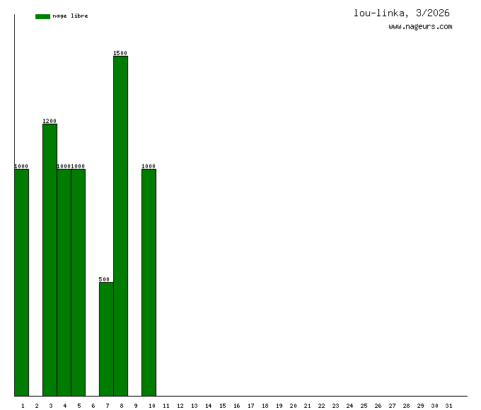 Ces 6 derniers mois, lou-linka a nagé dans les piscines suivantes : Piscine Saint Germain (Paris) (20.8 km), Piscine Blomet (Paris) (19.4 km), Piscine Marie-Marvingt (ex Saint Merri) (Paris) (10.1 km), Stade nautique Maurice Thorez (Montreuil) (9.2 km), Piscine de Nogent-sur-Marne (7.5 km), Piscine Alfred Nakache (Paris) (5.8 km), Piscine Cour des Lions (Paris) (4.2 km), Piscine municipale de Bagnolet (3.2 km), Piscine Rouvet (Paris) (2.4 km), Piscine Molitor (Paris) (2.3 km), Piscine Butte aux Cailles (Paris) (2.2 km), Piscine Jean Boiteux, ex Reuilly (Paris) (2 km), Annette K. (Port Javel Bas, Paris 15ème (M° Javel)) (2 km), Piscine de Pontoise (Paris) (1.5 km), Piscine Jean-François Henry (Chatou) (1.5 km), Piscine Suzanne Berlioux (Paris) (1.5 km), Piscine Robert Belvaux (Le Perreux Sur Marne) (1.2 km), Piscine Thérèse et Jeanne Brulé (ex Elisabeth) (Paris) (1000m), Piscine Keller (Paris) (1000m), Piscine René et André Mourlon (Paris) (1000m), Piscine Georges Rigal (Paris) (1000m), Piscine Château Landon (Paris) (1000m), Piscine Château des Rentiers (Paris) (1000m), Piscine Solita Salgado (Paris) (1000m), Piscine Emile Anthoine (Paris) (800m), Piscine des murs à pêches (Montreuil) (500m).