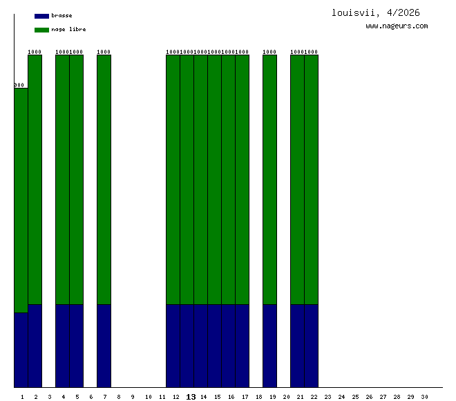 Ces 6 derniers mois, louisvii a nagé dans les piscines suivantes : Piscine Cour des Lions (Paris) (32.6 km), O2 falaises (Le Tréport) (6 km), Piscine Suzanne Berlioux (Paris) (3.7 km), Centre aquatique récréa de Briare (1.6 km).