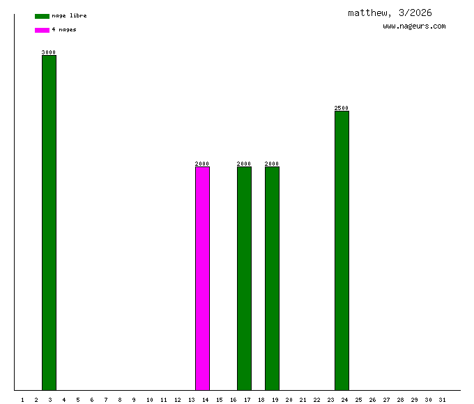 Ces 6 derniers mois, matthew a nagé dans les piscines suivantes : Stade nautique Henri Deschamps (Talence) (66.5 km), Piscine Olympique Villenave d'Ornon (2.7 km).