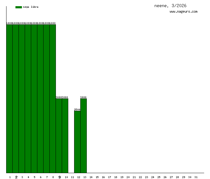 Ces 6 derniers mois, neene a nagé dans les piscines suivantes : Piscine d'Auteuil (Paris) (453.5 km), Piscine Emile Anthoine (Paris) (173 km), Espace aquatique Pays de Morlaix (Plourin-lès-Morlaix) (11 km), Piscine René et André Mourlon (Paris) (7.5 km), Piscine Henry de Montherlant (Paris) (3 km).