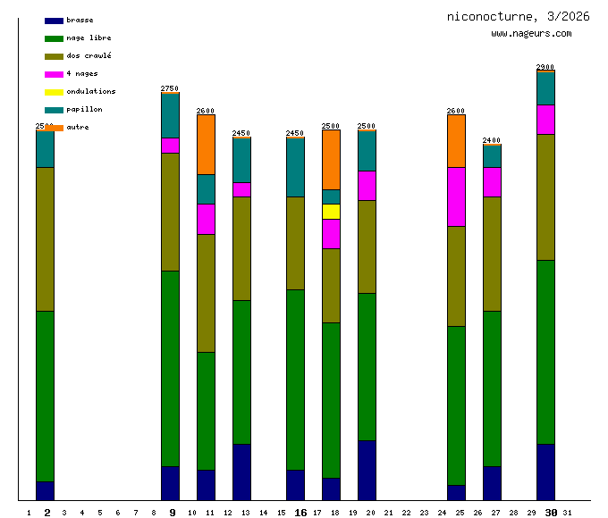 Ces 6 derniers mois, niconocturne a nagé dans les piscines suivantes : Piscine Aspirant Dunand (Paris) (46.5 km), Piscine Alfred Nakache (Paris) (43.9 km), Piscine Saint Germain (Paris) (27.8 km), Piscine Bellevue (Saint-Quentin-Fallavier) (18.1 km), Piscine Porte de la Plaine (Paris) (12.7 km), Piscine Thérèse et Jeanne Brulé (ex Elisabeth) (Paris) (7.2 km), Piscine du Ministère de la Défense (Paris) (3.6 km), Piscine Annette Kellermann (La Courneuve) (2.4 km).