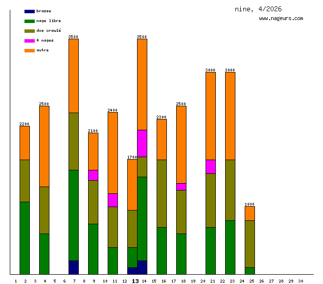 Ces 6 derniers mois, nine a nagé dans les piscines suivantes : Piscine Mulighausen (Les Lilas) (110.7 km), Piscine olympique du Grand Dijon (15.6 km), South pool club la Santa (Tinajo las Palmas, Espagne) (10.4 km), Piscine Paul Valeyre (Paris) (9.7 km), Piscine Pailleron (Paris) (8.4 km), Piscine Georges Vallerey (Paris) (7.6 km), Piscine Rouvet (Paris) (7.4 km), Piscine Suzanne Berlioux (Paris) (5.7 km), Piscine Château Landon (Paris) (5.7 km), Piscine Emile Anthoine (Paris) (5 km), Piscine Georges Hermant (Paris) (4.9 km), Piscine du Ministère de la Défense (Paris) (3 km), Piscine municipale de Bagnolet (3 km), Piscine Saint Germain (Paris) (2.6 km), Piscine Porte de la Plaine (Paris) (2.6 km), Piscine Armand Massard (Paris) (2.5 km), Piscine Cour des Lions (Paris) (2.5 km), Piscine Solita Salgado (Paris) (2.4 km), Piscine Hébert (Paris) (2.4 km), Centre aquatique la Calinesie (Libourne) (2.3 km), North pool club la Santa (Tinajo las Palmas, Espagne) (2 km), Piscine Blomet (Paris) (800m), Stade nautique de Drancy (700m), Centre Aquanautique Camille Muffat (Rosny sous Bois) (700m).