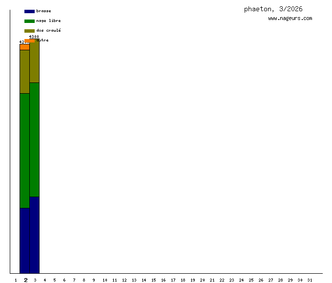 Ces 6 derniers mois, phaeton a nagé dans les piscines suivantes : Piscine Alban Minville (Toulouse) (88.9 km), Piscine Thérèse et Jeanne Brulé (ex Elisabeth) (Paris) (38.3 km), Centre Aquatique Olympique (Saint-Denis) (31 km), Piscine Jean Boiteux (Toulouse) (21.6 km), Piscine Pailleron (Paris) (10.1 km), Piscine Georges Vallerey (Paris) (9.2 km), Piscine Bellevue (Toulouse) (6.4 km), Piscine Suzanne Berlioux (Paris) (5.2 km).