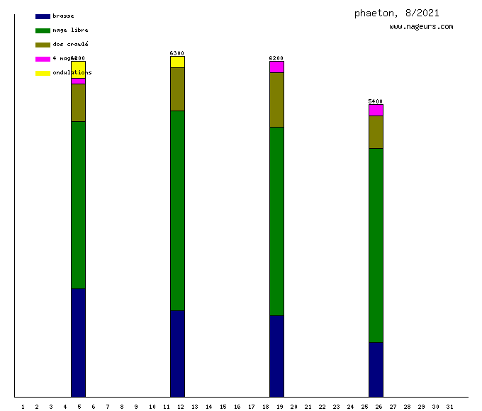 Ces 6 derniers mois, phaeton a nagé dans les piscines suivantes : Piscine Thérèse et Jeanne Brulé (ex Elisabeth) (Paris) (72.8 km), Piscine Alban Minville (Toulouse) (67.3 km), Piscine Jean Boiteux (Toulouse) (38.2 km), Piscine Pailleron (Paris) (10.1 km), Piscine Georges Vallerey (Paris) (9.2 km), Piscine Yvonne Godard (Paris) (5.2 km), Piscine Suzanne Berlioux (Paris) (5.2 km), Piscine Bellevue (Toulouse) (4.6 km).
