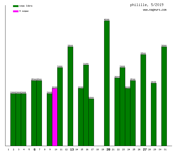 - • 3200 mètres le mardi 29 avril (de 10h55 à 12h29) à Piscine Olympique Marx Dormoy (Lille Bois Blancs) - Excellente séance: la forme et très peu de nageurs (tranche horaire idéale). Un plaisir!
