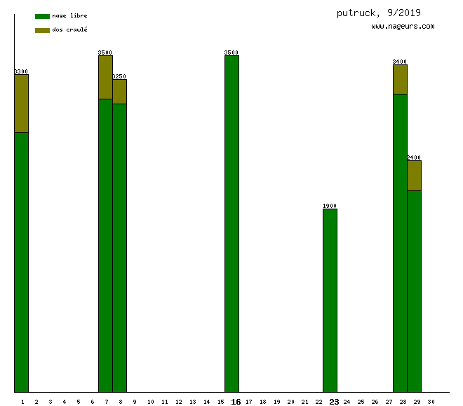 Ces 6 derniers mois, putruck a nagé dans les piscines suivantes : Piscine Georges Hermant (Paris) (63.8 km), Piscine Bernard Lafay (Paris) (54 km), Piscine Les Atlantides (Le Mans) (12.4 km), Piscine municipale de Coulaines (11.7 km), Piscine Solita Salgado (Paris) (9.3 km), Piscine Butte aux Cailles (Paris) (4.6 km), Piscine Georges Vallerey (Paris) (3.2 km).