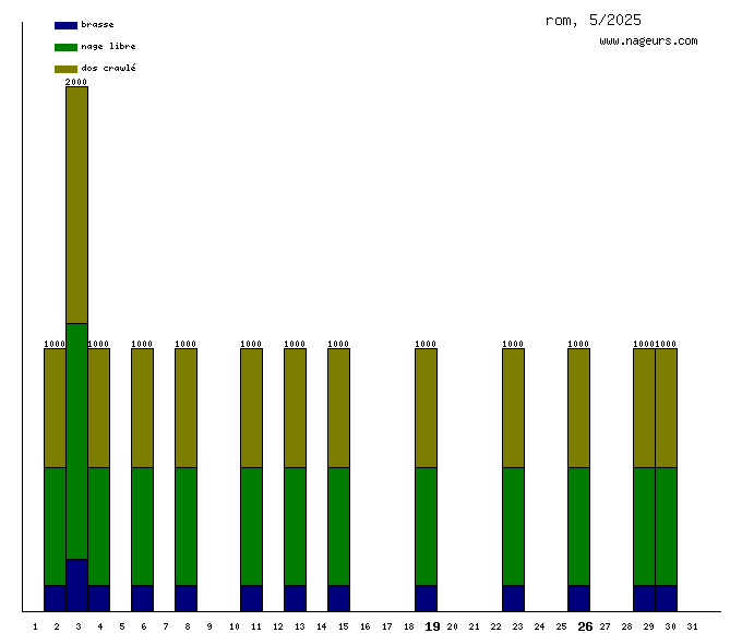 Ces 6 derniers mois, rom a nagé dans les piscines suivantes : Piscine Suzanne Berlioux (Paris) (91.6 km), Piscine Georges Hermant (Paris) (7 km).