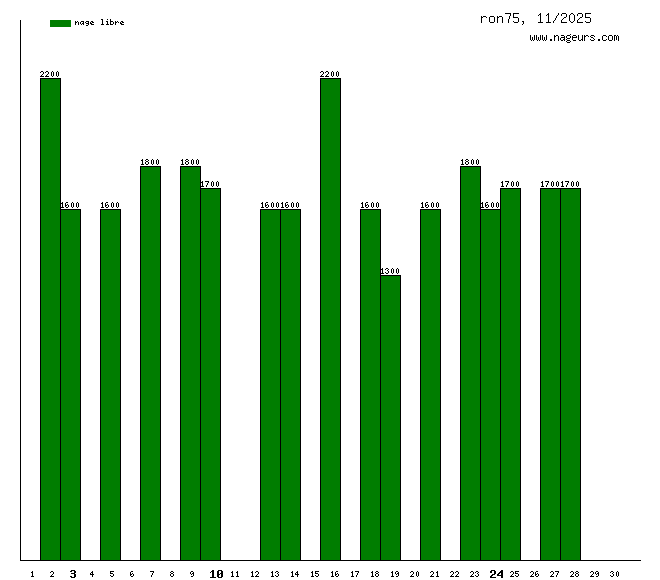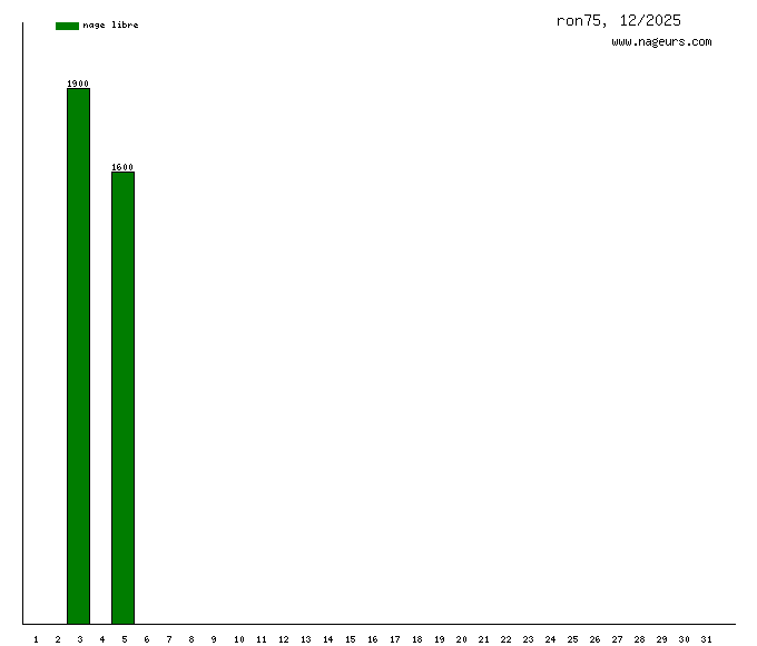 Ces 6 derniers mois, ron75 a nagé dans les piscines suivantes : Piscine de Bagneux (99 km), Piscine Blomet (Paris) (21.8 km), Centre Aquatique Treziroise (Plougonvelin) (11.7 km), Piscine Porte de la Plaine (Paris) (6.1 km), Aquapol (Montrouge) (5.2 km), Piscine Thérèse et Jeanne Brulé (ex Elisabeth) (Paris) (3 km), Piscine Georges Vallerey (Paris) (2 km).