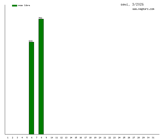 Ces 6 derniers mois, sewi a nagé dans les piscines suivantes : Piscine municipale de Gagny (17 km), Centre Aquatique Les Nymphéas (Noisy-le-Grand) (3 km), AquaFun Soest (Soest, Allemagne) (1.7 km).