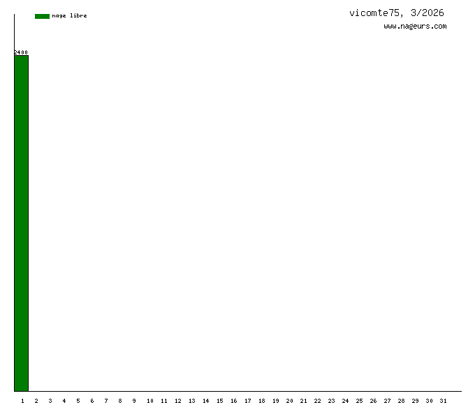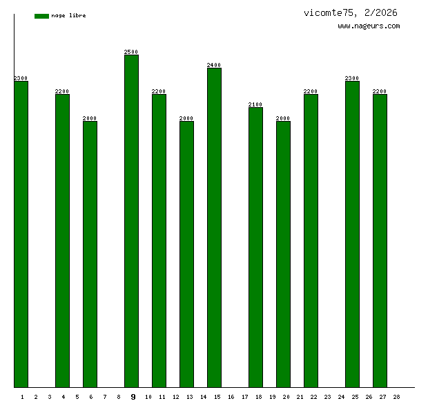 Ces 6 derniers mois, vicomte75 a nagé dans les piscines suivantes : Piscine du Ministère de la Défense (Paris) (66.5 km), Piscine d'Auteuil (Paris) (31.5 km), Piscine Emile Anthoine (Paris) (23 km), Piscine Henry de Montherlant (Paris) (22 km), Stade Nautique Gabriel Menut (Corbeil-Essonnes) (4.9 km), Piscine Keller (Paris) (4 km), Piscine Porte de la Plaine (Paris) (4 km).