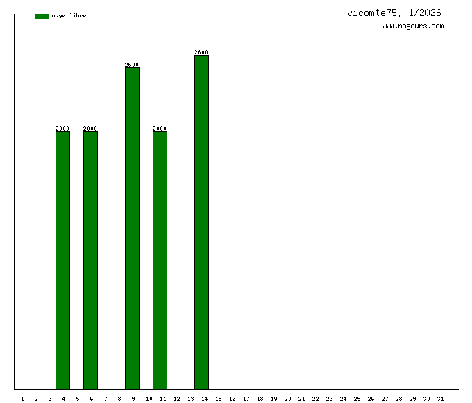 Ces 6 derniers mois, vicomte75 a nagé dans les piscines suivantes : Piscine du Ministère de la Défense (Paris) (63.2 km), Piscine d'Auteuil (Paris) (37.5 km), Piscine Emile Anthoine (Paris) (29.5 km), Piscine Porte de la Plaine (Paris) (8.1 km), Piscine Keller (Paris) (4 km), Piscine Henry de Montherlant (Paris) (2.5 km), Stade Nautique Gabriel Menut (Corbeil-Essonnes) (2.4 km).