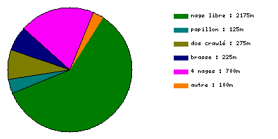 Un 400m avec trois coups de sifflet à chaque 90 secondes pour voir si où on arrive dans la longueur à chaque fois. Très content du chrono : 5min27. Ensuite un 100m 4N au chrono : 1min25 (nouveau record perso), et 200m crawl en 2min37