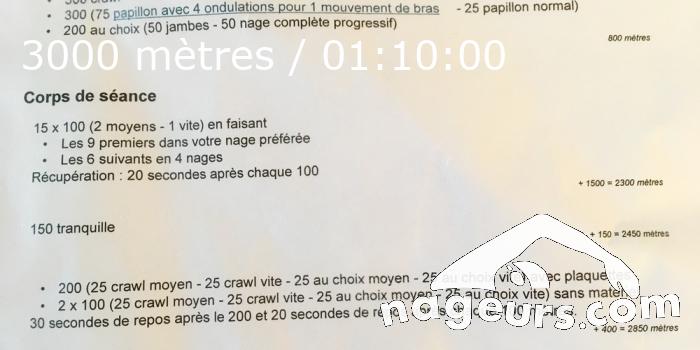 Le 15 x 100 : tout en crawl (faut pas déconner !) avec 0 à 20 sec de récup (départ toutes les 2') en fonction de la perf (lent, très lent, très très lent, moins lent ! )