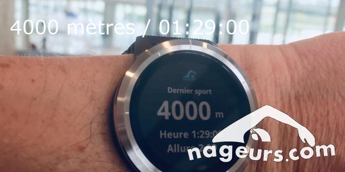 Enfin j’ai ma nouvelle montre, c’est tellement plus agréable de nager sans compter ses longueurs! Comme ces derniers temps j’alterne 1000m sans palmes et 1000m avec palmes pour atteindre 4000m en 89min. Une allure moyenne de 2.09min/100m ça me plaît (surtout que j’étais un peu fatigué par moment). Bassin de 50m extérieur complètement ouvert, à deux maximum par couloir, avec l’eau du bassin et celle qui tombait fort du ciel...que du bonheur 🏊♂️💙🤩