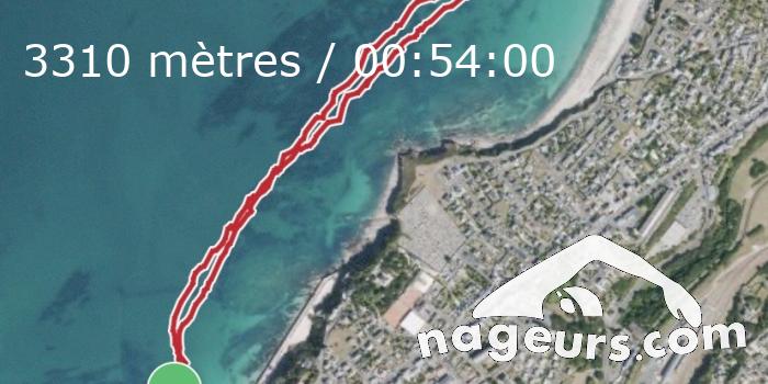 Granville - Donville à la nage. 3300m a/r, 54 minutes. Eau calme, début 1h avant la marée haute. Soleil, du courant, pas mal de méduses.