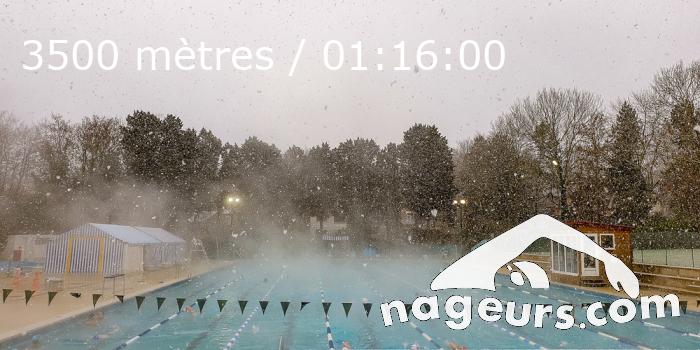 • de 12h15 à 14h00, glycine a nagé 3300 mètres : Sous la neige, encore ! Soit deux séances de suite, alors que ça ne m'était jamais arrivé les 1089 précédentes fois.